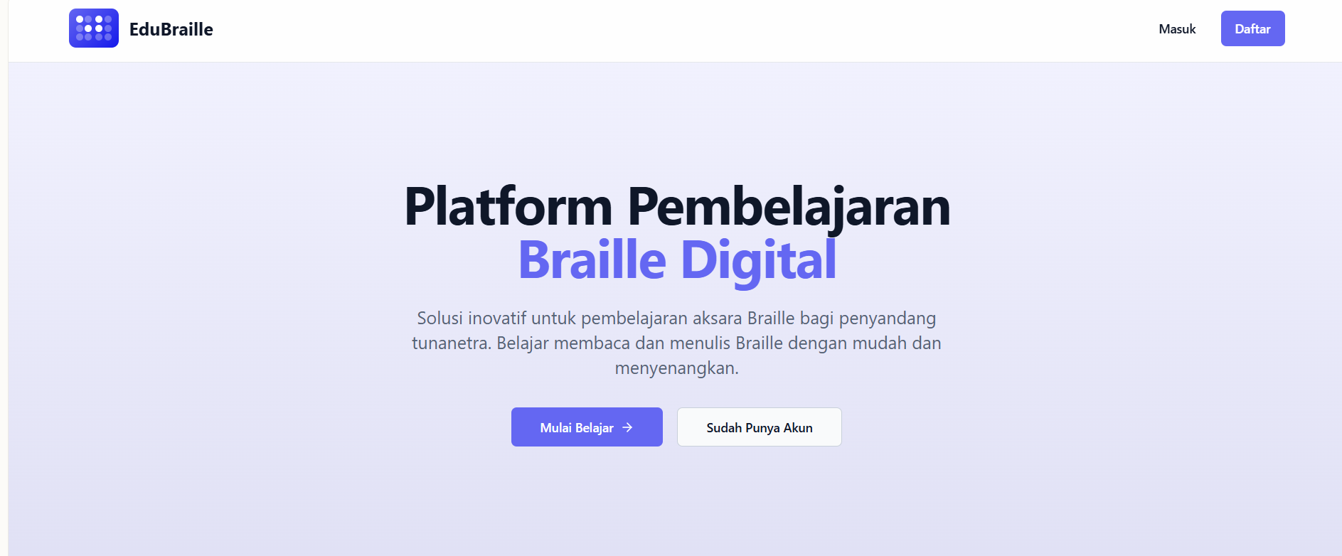 Platform edukasi berbasis IoT untuk penyandang tunanetra. Website yang aksesibel dan terkoneksi dengan refreshable braille display.