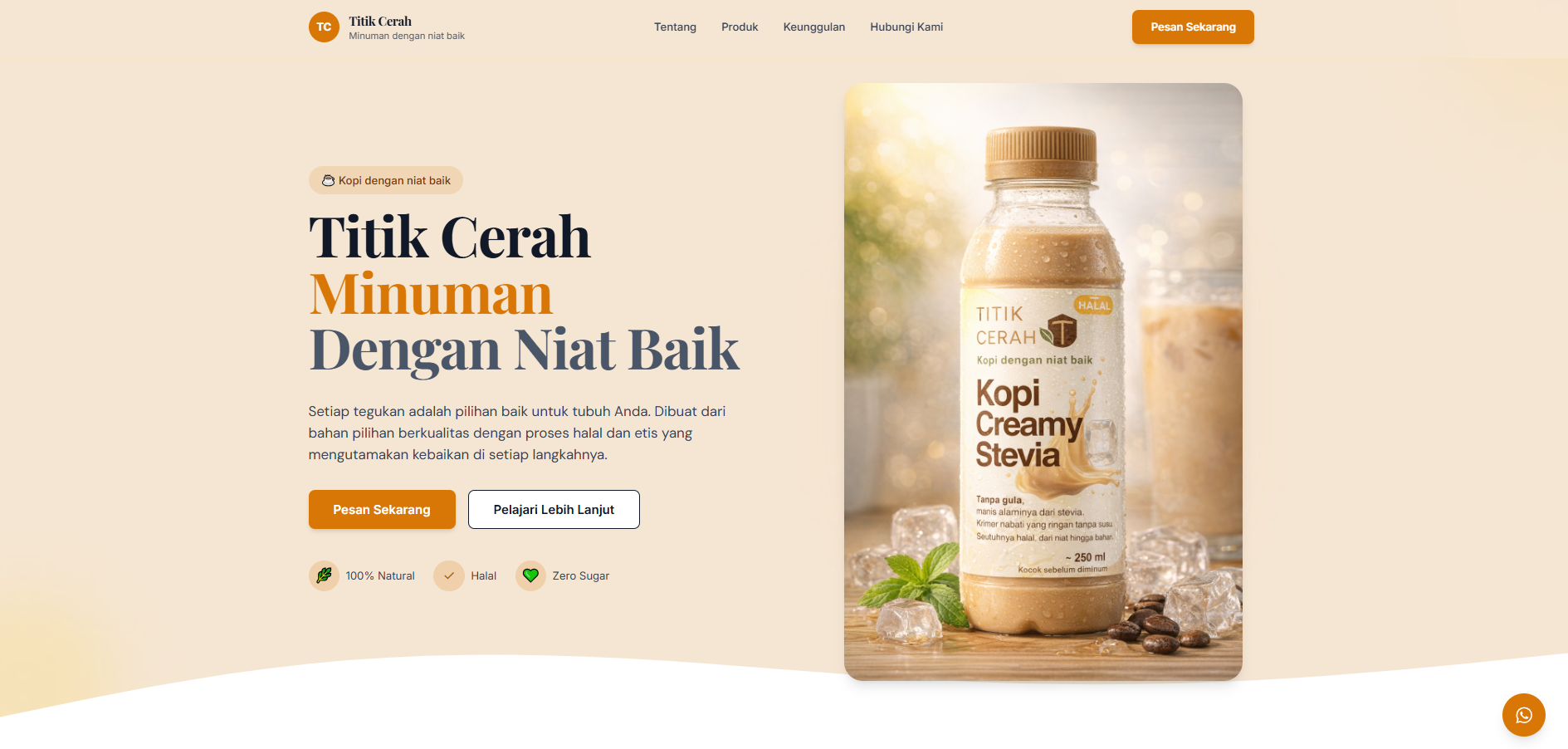 Website produk kopi botol Titik Cerah. Kopi dengan niat baik dari niat hingga bahan. Kopi creamy tanpa gula. Minum tanpa rasa bersalah.